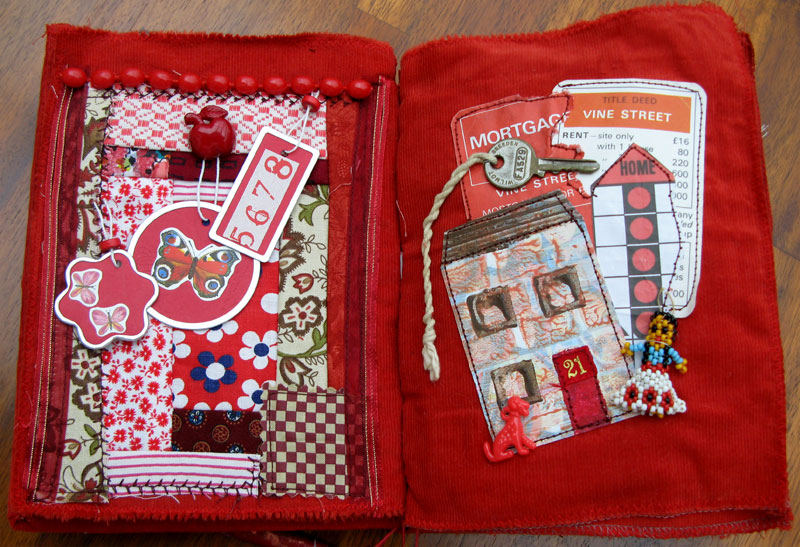 I've used art, found papers, printed papers, fabrics both found and printed, recycled items and bits and bobs from my stash and all to do with the colour red. All the edges have been oversewn on the machine and the front and back are padded and stiffened with card.