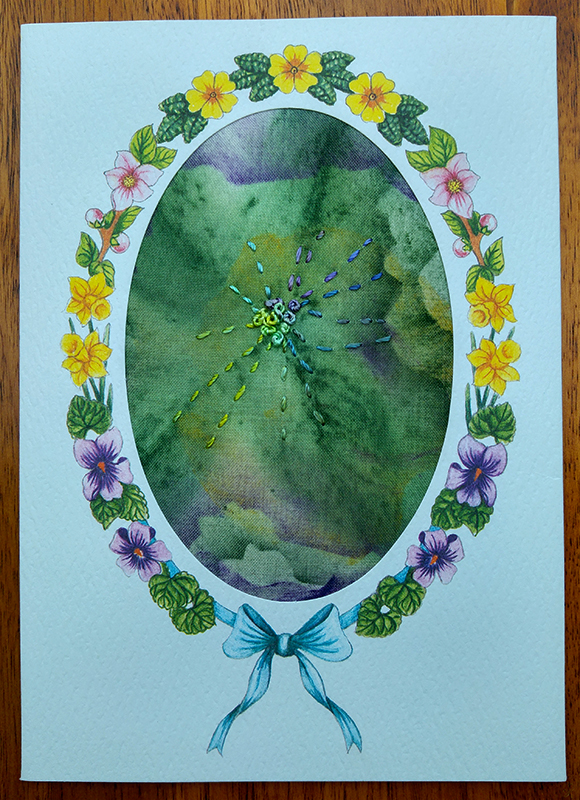 Greetings card with hand painted fabric and embroidery