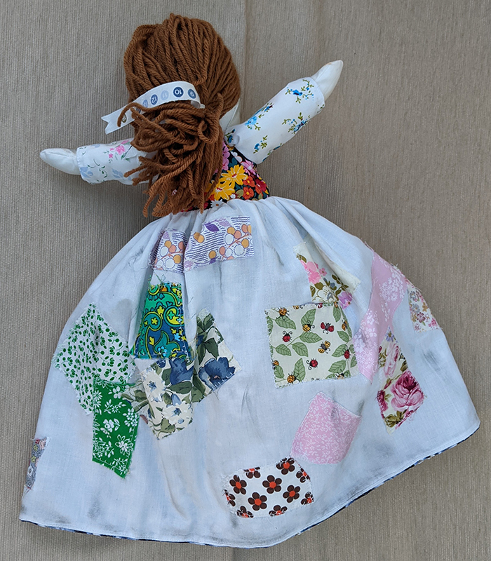 I've been wanting to make one of these dolls for a while. I was going to make my own pattern but then I saw some on Etsy and decided to buy one. I'm not that good at following patterns so I had problems all the way. Having said that the instructions were not that good, quite confusing at times. She has an unusual shaped head for a rag doll and together with my cutting out, stitching and stuffing the shape was even more unusual. I also decided to paint on her features instead of embroidery. This didn't go well and one head ended up really messy so I decided to make her into Cinders and have a patchy and grubby dress. She looked a lot better after her hair was put on but her features could be better. She was supposed to have a smart dress one side and housecoat on the other, I made the housecoat into the patchy dress with added 'dirt'. It was really hard sewing puff sleeves into the dress. I used fabrics and wool I'd already got. How do people sew really small fiddly things? I may make another tospy turvy doll in the future but I don't think I'll be using this pattern even though I quite like her now.