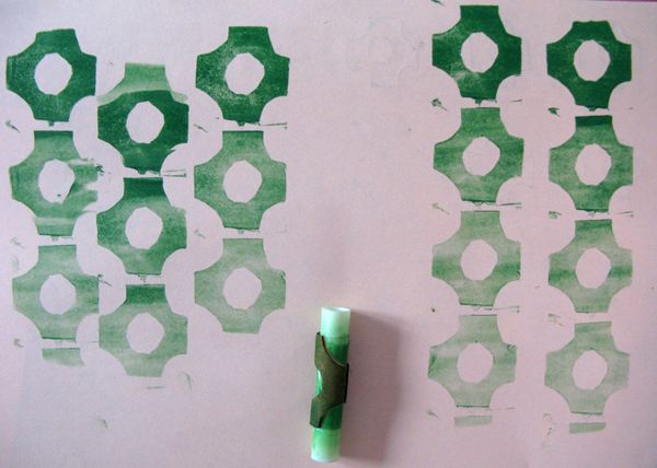 The paint will last longer on the bigger rollers as they cover a bigger area, the paint will become lighter the further you roll, but there are some nice effects when the paint is a quite light. Apply more paint to the roller if it becomes too faint, even if half way across the page. Experiment on scrap paper to check the amount of paint required for your chosen effect and pattern maker. Add water to the paint as required, it may need to be a little runnier for fabric. A pattern can be built up by using one roller on top of another after the previous one has dried.